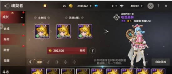 4.获得魂契者之后,一般普通的魂契者是可以强化到三星的,一星则是10等级,游戏中的最高【传说】魂契者是可以强化到80级的,而这个强化星级需要的材料比较苛刻,在游戏中玩家们如果要合成的话就必须要使用三个同等级,同稀有度的魂契者来进行合成,被强化的前期是,主卡必须等级强化到了最大,比如普攻卡最高等级30级,一定要强化到30级之后才可以进行合成!