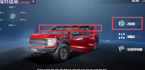 2.解锁了路霸身份之后点击载具按钮,进入载具界面后就可以看到该界面多出一个改装按钮,点击改装就可以进入改装的功能页面对汽车进行改造了.