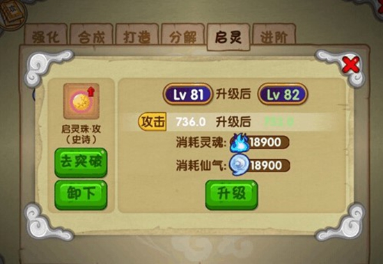 4、分解装备:在主界面的云中子处(炼丹炉)的分解界面,可以对装备进行分解,分解后可以获得一定量的仙气,值得注意的是,只有品质在蓝色及蓝色以上的装备才能进行分解哦!