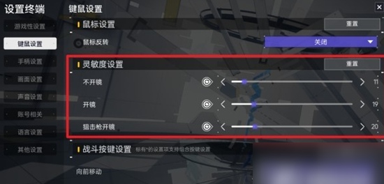 2.本作目前不支持单个角色设置灵敏度,所以在设置灵敏度时无法根据具体角色调整,建议以最常用的角色为准,进入任意战斗关卡,一边战斗一边按ESC打开设置界面进行微调,直到感觉舒适即可。不开镜指左键射击时鼠标移动的速度,开镜指除狙击枪之外右键开镜后鼠标的移动速度,狙击枪开镜指狙击枪右键开镜后鼠标的移动速度。下图为PC端设置参考。