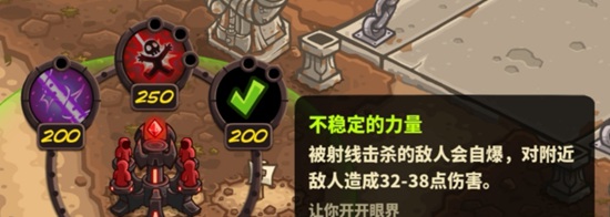 毁灭射线的效果就不用说了,强到离谱的一个技能的,直接能够秒杀一个敌人,升到满级的毁灭射线触发的CD还是比较快的,这个技能在面对任何小型boss的压制是非常明显的,小编建议大家优先点这个技能。不稳定的力量这个技能也是很强的,它的触发概率非常高的,不仅自己杀死的敌人能够触发这个效果,补刀其他防御塔的敌人也能够触发,这个技能能够频繁的触发,因此它在一局内能够带来的伤害还是很高的。