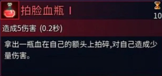 3、拍脸血瓶使用时将会扣除玩家固定的四点生命值,把玩家已损失血量的一部分变成黄血,也就是回复,这个数值会随着玩家属性的叠加,会从25%慢慢涨到50%,冷却时间为十秒。并且可以刷出一些范围型伤害词条,比如电击附近的敌人8秒或者释放毒云之类的。