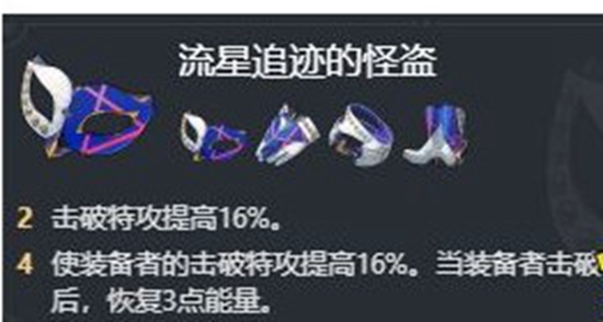 可提提高卡芙卡击破能力,配合流星追迹的怪盗4件套,破弱点能力极强,专属武器的加速度,以及鞋子25速度,速度可达145,可以获得盗贼公国塔利亚2件套的效果,击破特攻额外提高,大大提高击破伤害。