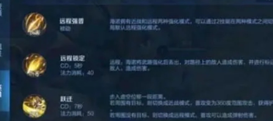 【被动技能:远程强普】海诺拥有两种攻击模式,一个是近战,一个是远程,可以通过二技能来进行切换。不同攻击模式下,普攻和一技能会不一样。开局默认是远程攻击。所以,开局似乎可以选择二技能开局,让海诺多一种变化。两种攻击方式有点像司马懿。