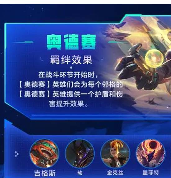 羁绊效果:在战斗环节开始时,【奥德赛】英雄们会为每个邻格的【奥德赛】英雄提供一个护盾和伤害提升效果。