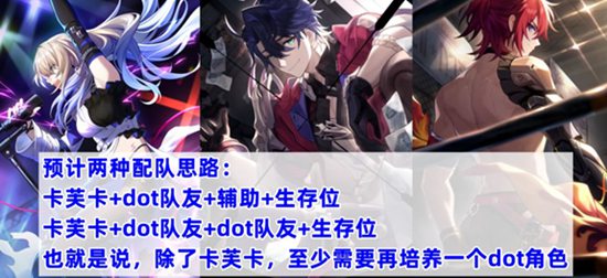 2.因此,只要抽卡芙卡,基本不用担心没有队友,更需要关心的是有没有资源培养。目前来看,卡芙卡的常规配队思路有两种,一种是搭配一个dot角色+辅助+生存位,另一种是搭配两个dot角色+生存位。也就是说,至少要培养一个dot角色,加上卡芙卡就是两个,如果之前没培养希露瓦或者桑博,短期内的养成压力肯定是有的。
