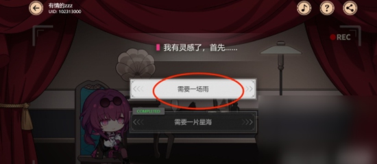3、继续点击卡芙卡进入下一个独白,我们选择【需要一场雨】;这时剩下的选项因为已经达到选择上限无法继续选择,我们只需要选择可以点击的独白就行。