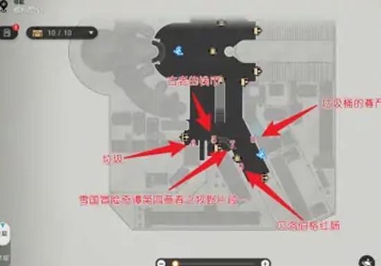 1.打开游戏地图,前往行政区图中位置,收集吉姆罗杰面包味汽水、拼接而成的信件、冷吃夕红鱼、好看的垃圾。