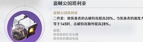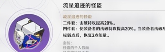 怪盗套装是一个被所有玩家忽视的套装,这个套装给卡芙卡以外的合适,能够提高击破特攻,这里需要说明的是,破盾触发感电的伤害是吃击破特攻的加成的,所以带这个套装可以增加破盾感电的伤害,并且攻击破盾的单位还能够回复能量,增加大招的覆盖率,所以这个套装也是可以当做卡芙卡的成型套装来使用的。