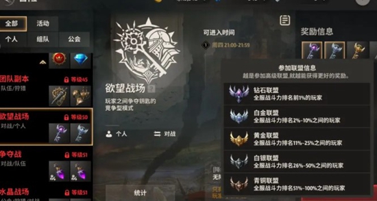 2.因为利益驱动,玩家不可能放弃对其他玩家的攻击,只为单纯地击杀怪物。这也导致了互相之间的战争不可避免。在欲望战场中,玩家会根据战斗力分为5个联盟,保证大家都能平等地参与其中。欲望战场每周四晚上9:00 ~ 10:00开放,每位玩家可以参加两次,每场战斗由30名玩家组成,分为黄金、白金和钻石等不同难度级别。这样即使实力不强劲的玩家也能够参与其中,避免因为实力弱而被轻松击败。