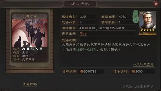 1.战法效果——为损失兵力最多的我军单体清除负面状态并为其恢复兵力(治疗率256%, 受智力影响)!