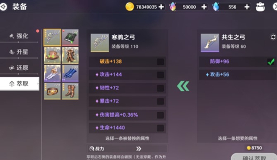 3.如果你打到了重复的装备,一定先鉴定一手,如果出了高级附加属性,可以通过萃取把这些属性转移到对应部件上,更高的属性值也能替换较低的属性。但要知道,被萃取了属性的装备将会损坏,无法再次装备了!