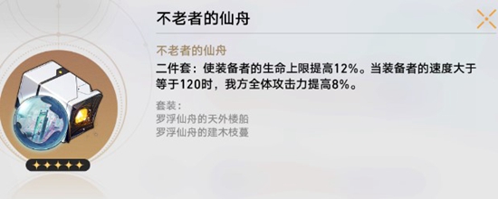 2、仙舟2件套可以使装备者的生命上限提高12%。而且当装备者的速度大于等于120时,我方全体攻击力提高8%。