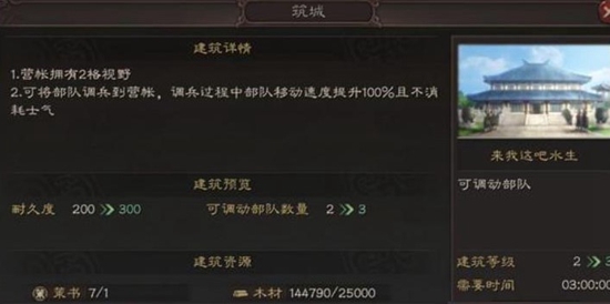 1.大家需要明白的是搭建营帐也是有前提条件的,那就是主城的等级至少要到四级,所以没到等级之前不用考虑,等级达到之后可以将自己主城里面的工程营以及军机营进行升级,到达一级那么此时就是满足了搭建的条件。