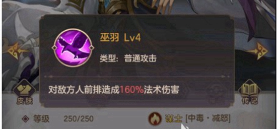 1.贾诩是一个群攻角色,有一个普通攻击、一个技能攻击和一个天赋加成,首先来讲普通攻击,它叫做“巫羽”,使用以后可以对敌对目标前排人员造成法术伤害。
