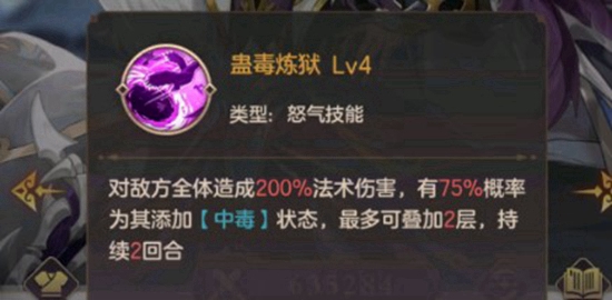 2.然后是技能攻击,这个是属于怒气技能,叫做“蛊毒炼狱”,在使用以后可以让敌方全体目标添加一个每回合都会扣除一定生命值的debuff,且无视任何防御,这个技能最多可以叠两层且只能持续两个回合。