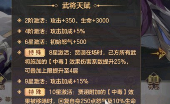 3.最后是天赋加成,这个需要玩家将贾诩进行升阶升星的养成才可以,每加成两阶都会获得额外加成,比如激活了2阶人物就会增加攻击和血量,升到6星则会增加初始的怒气值,让人物输出更快,且如果到8星甚至10星的话,只要贾诩在场,己方又有可以施毒的武将,那么中毒的效果、层数以及回合数都会提升。