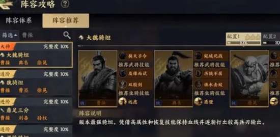 2.然后是第二套阵容骑坦流,该阵容是由曹操、典韦、许诸组成的,除此之外还需要带上断流水源、以防为攻等技能,当这些技能搭配完成后该阵容也就成型了,在构成之后大家就能将这套阵容放到实战中了。在实战中,该阵容虽然是一套骑兵流的阵容,但是区别于其他的骑兵,这套骑兵流阵容是属于防守反击的打法,所以在兵力的消耗上,是要远低于传统冲锋流的骑兵的。除了这一点之外,其他和骑兵基本一样。可以说是完全补足了骑兵唯一的缺点,让骑兵变的无懈可击,因此该阵容顺利的成为了版本t0阵容。