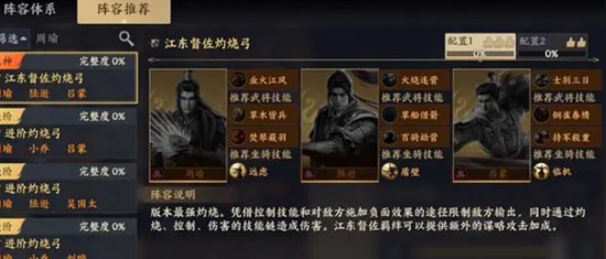 3.第三套灼烧流,这套阵容是由陆逊、周瑜、吕蒙所组成的,另外还需要搭配他们三个的专属火攻技能,在搭配完成后该阵容在实战中就可以打出非常恐怖的法术伤害,另外还可以让敌人一直处在火焰烧伤的状态下,在这高输出加上稳定的debuff输出的情况下,可以说没有阵容能吃得住该阵容的伤害。