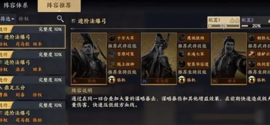 4.第四套法暴流,这套阵容是由诸葛、司马懿以及郭嘉组成的,另外再加上雪月成阙、水淹七军和当局者迷这三个技能,在搭配好阵容成型之后,这套阵容就能拥有全游戏中最高的法术输出,比起上一套火烧流来说是要高不少的。