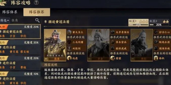 5.最后是第五和第六套阵容,前者第五套阵容是法盾流,该阵容是由张角、于吉和左慈组成的,另外还需要搭配上草木皆兵、扇惑、三马同槽等防御技能,搭配完成后该阵容就能获得将近90%的法术伤害减伤,在面对法师阵容的时候该阵容可以说是相当无解的,让不少法师强队在自己的组合面前都黯然神伤。