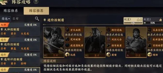 6.后者第六套阵容则是主打控制流的阵容组合,该阵容是由吕布、董卓、徐晃组成的,另外还需要搭配上他们三人的专属技能,当这套阵容完全组建成功之后将他们放到实战中就能看到该阵容恐怖的控制能力了。在控制方面,该阵容中的几位角色都有控制率提升的特性,再搭配上面的控制技能,可以说是能不间断控制敌人的。另外这几位角色的输出也是很高的,这种高输出搭配上自身的高控制,是能做到在控制期间内稳定击杀敌人的效果的,这个效果目前来说只有该阵容能做到。