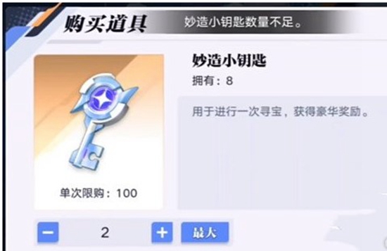 3.妙造钥匙在没有特殊优惠的情况下,是180钻石可以购买一把。一般一次性最多可以购买100把钥匙。钻石的获取渠道有任务,活动和签到三种较为常见的。玩家们也可以在有优惠的时候进行钥匙的购买。