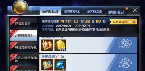 5、升级活动,每天参加比赛获得足量的经验就可以进行升级,升到特定的等级就能获得钻石奖励。