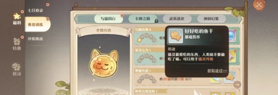 2.第二种方式则是前往福利中的勇者训练,这里面有很多板块,其中第一个板块是与猫同行,该板块中给予的奖励多数都是猫灵的培养资源,所以其中自然也包括鱼干,只需要你将猫灵按照指定的条件进行培养,那么就可以在它里面获取海量的鱼干。