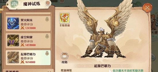3.【魔神试炼】分两普通和困难两种模式,普通难度为6个boss,最低的boss莫格拉斯挑战评分为115000分起步,最高是巴耶力596000评分,玩家需要挑战6个boss才能够正式通关。